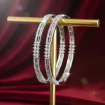 Elegant silver-finish fixed bangles crafted with intricate baguette detailing and sparkling floral stone clusters. Perfect for weddings, festive occasions, and statement party styling.