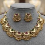 Paired with matching crescent-shaped stud earrings, this set is ideal for weddings, festive occasions, and traditional wear. Its timeless design complements sarees and ethnic outfits, offering a regal look with comfortable wear.
