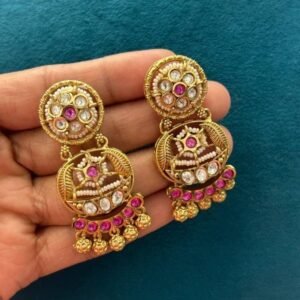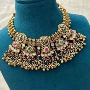 This traditional crescent-style necklace set is crafted in a rich gold finish and features elegant crescent motifs accented with green and pink stones. The necklace is beautifully finished with layered gold chain tassels that add graceful movement and a classic heritage appeal.